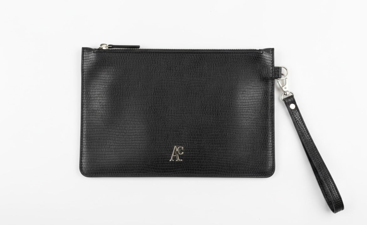 Busta pochette porta documenti in vera pelle di vitello, con stampa serpentino, derivata da dead stock e scarti, per donare nuova vita a materie prime nobili e di altissima qualità, che sarebbero altrimenti divenute un rifiuto.