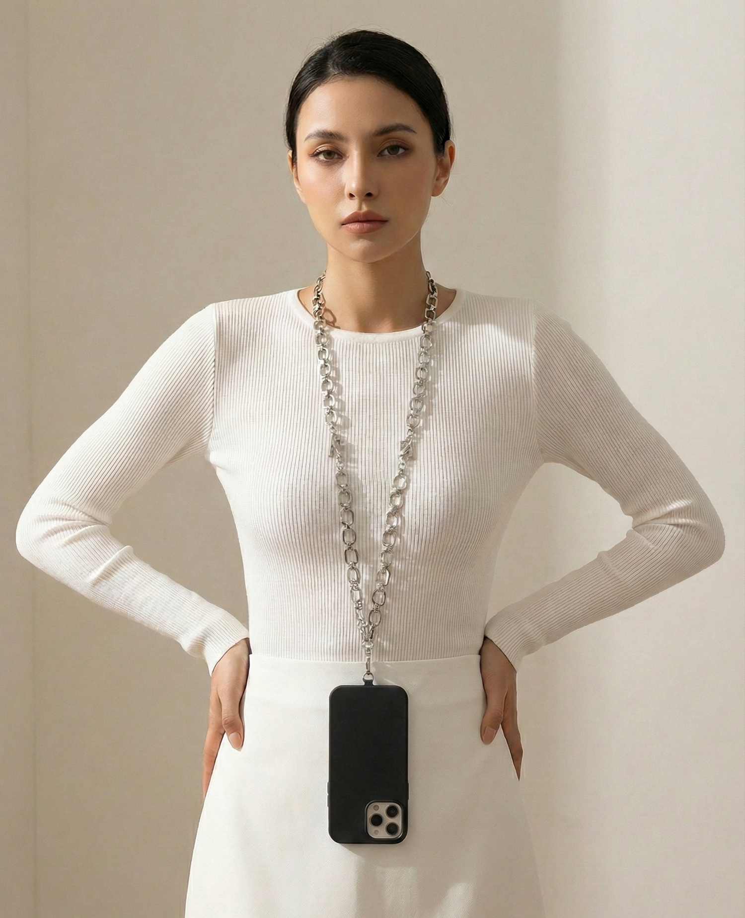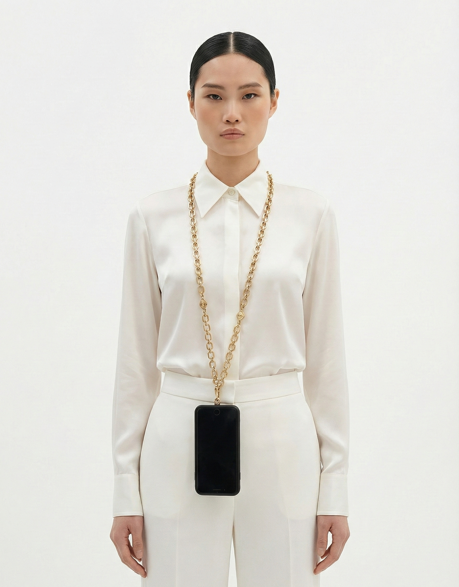 La struttura leggera ma resistente permette di portare lo smartphone con comodità, trasformandolo in un vero e proprio dettaglio di design. La piastrina marchiata aggiunge un tocco iconico, creando un equilibrio tra estetica moderna e identità di brand.